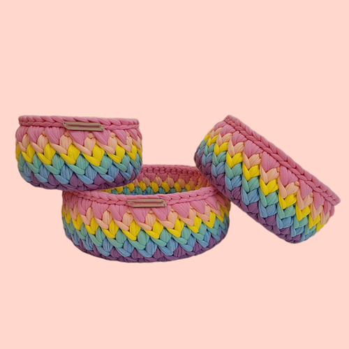 سبد قلاب بافی تریکو طرح رنگین کمان کجراه کد 6 مجموعه 3 عددی