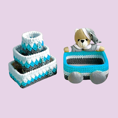 مجموعه ارائه شده شامل چهار سبد میباشد که با بافت قلاب بافی از نخ تریکو پارچه ای تهیه شده است .در ابعاد 25 در 15 و 15 و 10 سانت میباشد و مناسب نظم دهی اتاق خواب و اتاق کودک و لوازم زینتی و بهداشتی میباشد.